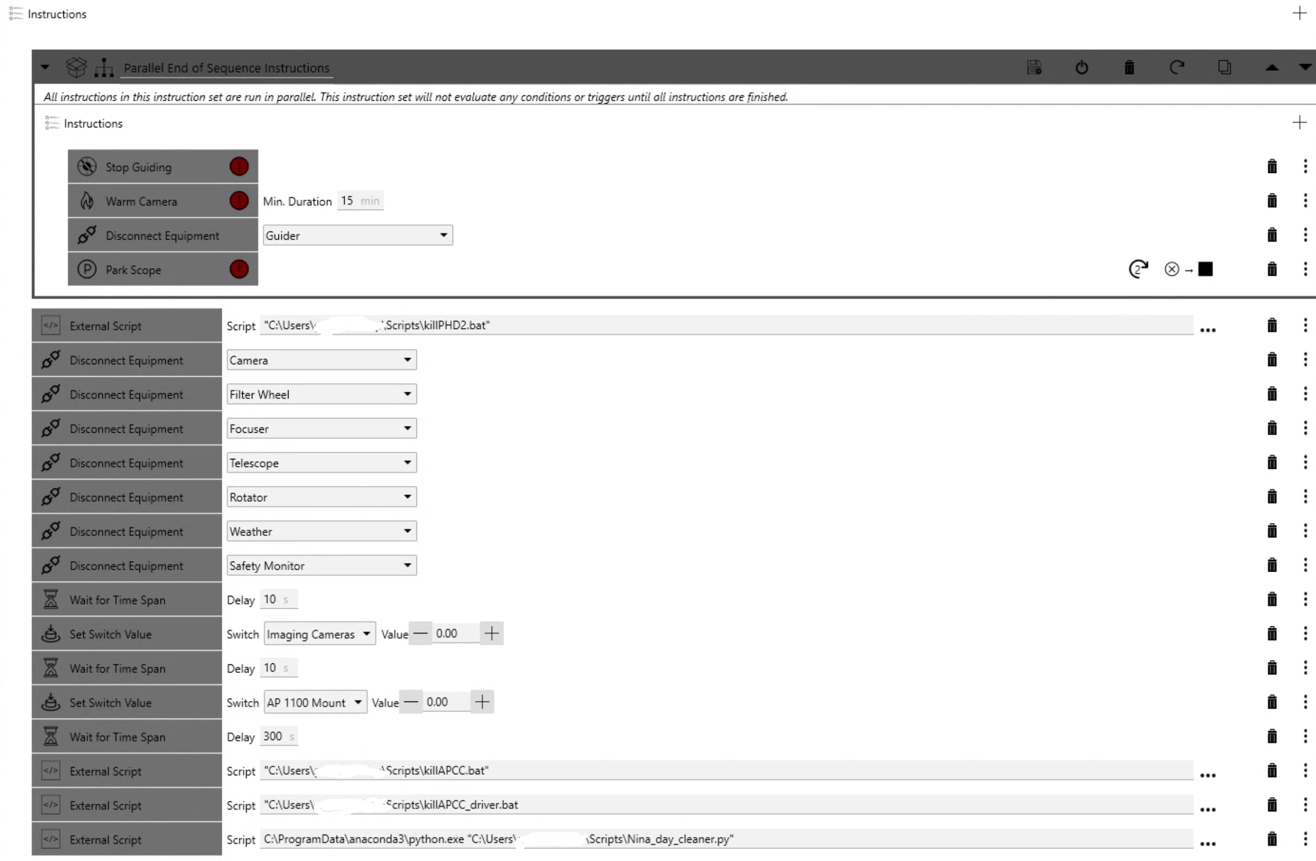 - The shut down is pretty simple as well. In parallel stop guiding, warm the camera, disconnect the guider and park the scope. Then shut down the guide software (I just kill PHD2, as it seems there is no graceful exit). Then we need to disconnect the equipment. A “disconnect all” would not work, as it would disconnect the PDU as well, making it impossible to shut down the power to the equipment. So unfortunately each ASCOM driver must be shut down individually. Once the ASCOM drivers have been disconnected, one can power off each individual component and kill the mount software via script. The last script, written in Python, automatically detects and remove bad frames (based on the optional NINA log), in particular eliminating frames with bad guiding, no stars or poor seeing/focus solution (large FWHM). Then that scripts performs clean up, back up, move files and start synchronization with the remote server. Last it performs watch dog functions and forcibly kills or hard shut down any equipment still up at that point.