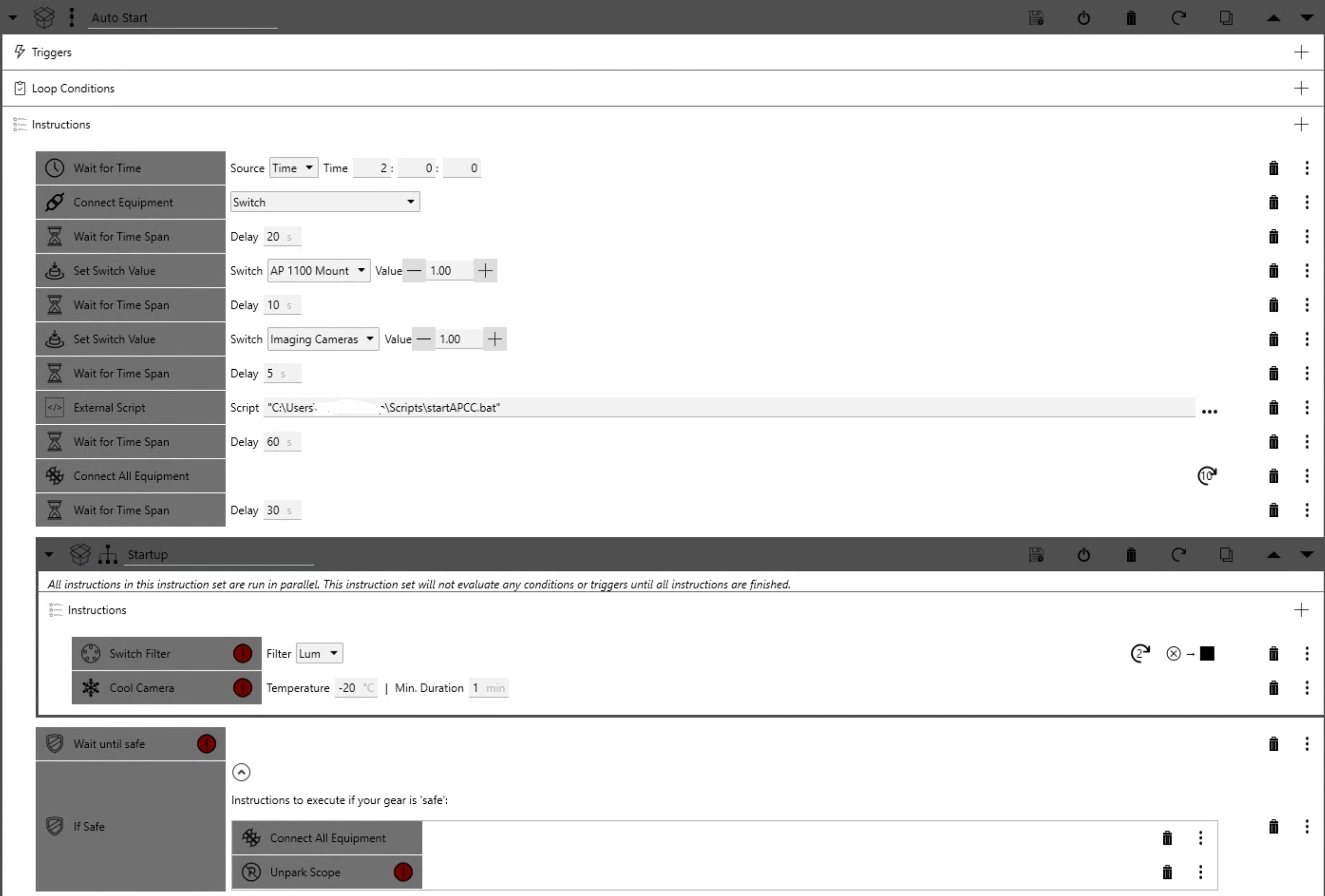 - The start up is pretty straight forward: connect to the switch, wait 20s, and power up the mount, then the camera. Then start the mount software (APCC), here via a script (as I do not care paying a subscription just to have the NINA “start APCC” module). Then connect all equipment (imaging camera, guider, filter wheel, mount and focuser) in ASCOM. Then set the filter to Luminance, for the first plate solve and focusing of the night and cool the camera. After that, if conditions are safe (roof open), move to imaging.